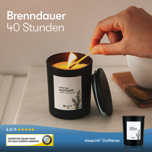 Mit unserer hochwertigen Duftkerze bringen Sie pure Entspannung in Ihr Zuhause. Die nachhaltige Kerze besteht aus 100% veganem Sojawachs, einem bleifreien Docht und verbreitet einen wohligen Rosmarinduft im ganzen Raum. Die Brenndauer der Kerze liegt bei etwa 40 Stunden. Wir empfehlen, den Docht vor jedem Anzünden zu zentrieren. Das hochwertige mattschwarze Glas kann mit einem schwarzen Echtholz-Deckel geschlossen und das natürliche Aroma somit für längeren Duft konserviert werden.